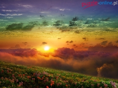 Zachód, Łąka, Kolorowe, Chmury, Słońca