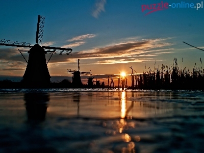 Zachód, Szuwary, Wiatraki, Rzeka, Chmury, Słońca