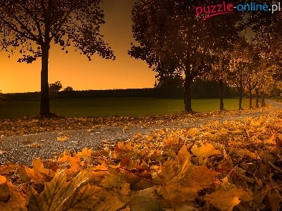 Zachód słońca, Jesień, Droga, Drzewa, Liście