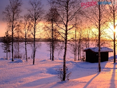 Puzzle Śnieg, Drzewa, Zachód Słońca