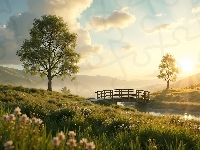 Łąka, Mostek, Rzeka, Zachód słońca, Drzewa