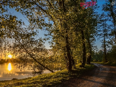 Zachód słońca, Rzeka, Drzewa, Droga