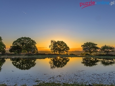 Puzzle Zachód słońca, Rzeka, Drzewa, Odbicie