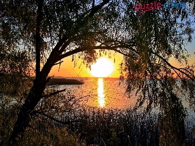 Puzzle Zachód, Jezioro, Drzewo, Słońca