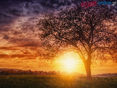 Puzzle Zachód słońca, Pole, Drzewo, Chmury