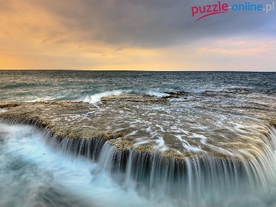 Puzzle Zachód słońca, Morze, Fale, Skała
