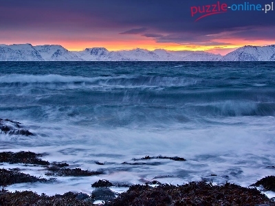 Puzzle Zachód, Morze, Góry, Słońca