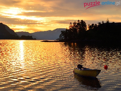 Zachód słońca, Łódź, Jezioro, Góry, Drzewa