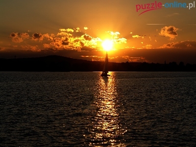 Puzzle Zachód, Chmury, Jezioro, Żaglówka
