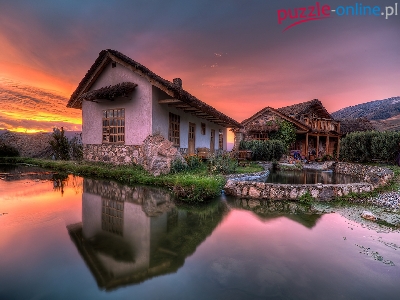 Puzzle Zachód, Dom, Jezioro, Słońca