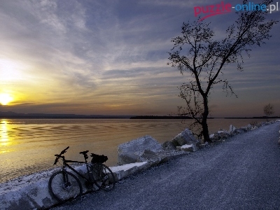 Zachód, Rower, Droga, Jezioro, Słońca
