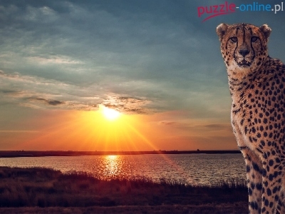 Puzzle Zachód, Gepard, Jezioro, Słońca