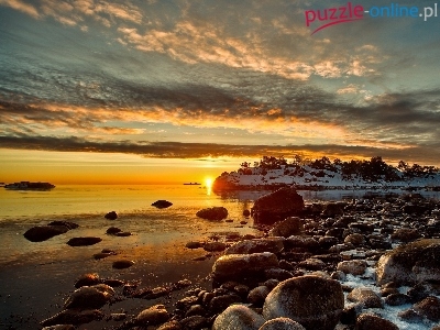 Puzzle Śnieg, Jezioro, Kamienie, Zachód Słońca