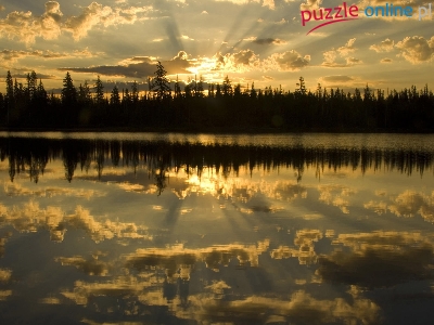 Zachód, Odbicie, Las, Jezioro, Słońca