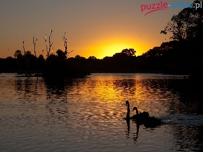 Puzzle Zachód Słońca, Jezioro, Łabędzie