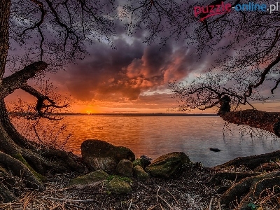 Zachód Słońca, Jezioro, Drzewa