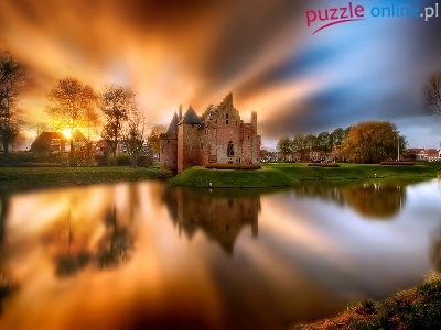 Puzzle Zachod Słońca, Zamek, Jezioro, Holandia