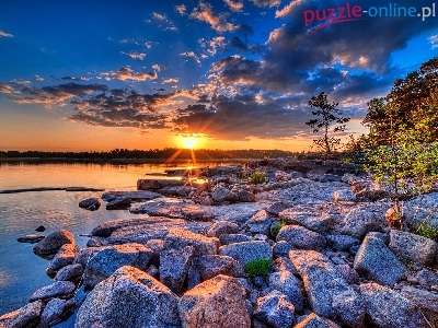 Puzzle Zachód, Jezioro, Kamienie, Słońca