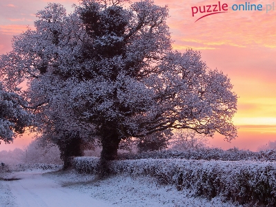 Zachód słońca, Mgła, Śnieg, Droga, Oszronione, Krzewy, Zima, Drzewa