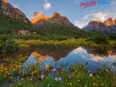 Góry, Łąka, Jezioro, Zachód słońca, Kwiaty