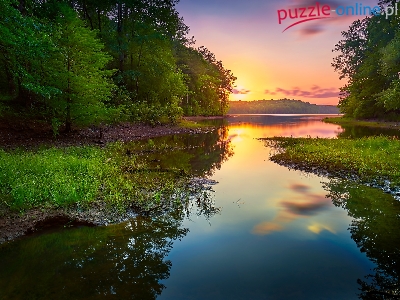 Puzzle Zachód słońca, Rzeka, Las, Drzewa