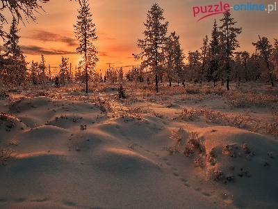 Puzzle Zachód słońca, Zima, Las, Śnieg