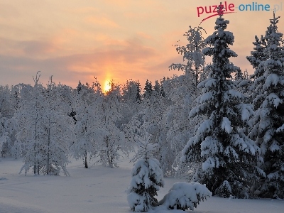 Puzzle Zachód słońca, Zima, Las, Świerki