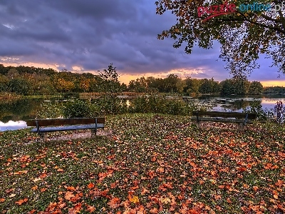 Zachód Słońca, Drzewa, Rzeka, Liście, Ławki