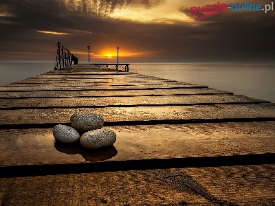 Puzzle Zachód słońca, Morze, Molo, Kamienie