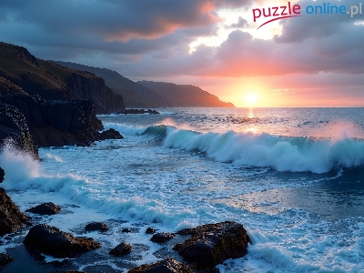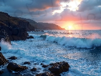 Klify, Fale, Morze, Zachód słońca, AI, Skały
