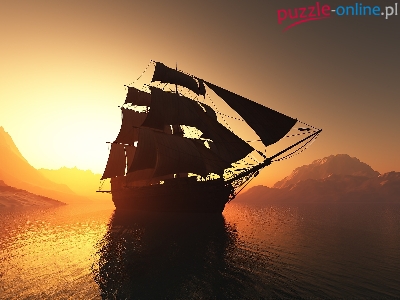 Puzzle Zachód Słońca, Góry, Morze, Żaglowiec