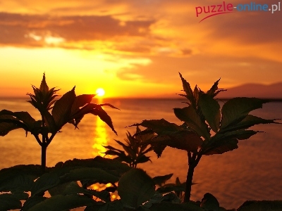 Puzzle Zachód, Rośliny, Morze, Słońca