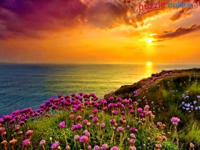 Puzzle Zachód Słońca, Morze, Kwiaty