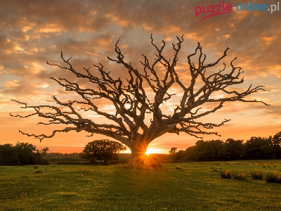 Zachód słońca, Gałęzie, Drzewa, Drzewo, Bezlistne, Niebo, Pole, Trawa