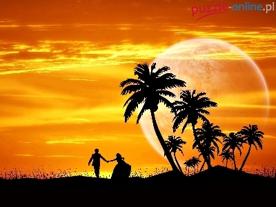 Zachód, Zakochani, Palmy, Grafika, Niebo, Słońca