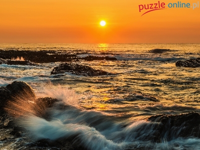 Morze, Fale, Skały, Zachód słońca, Niebo