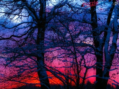 Puzzle Zachód, Drzewa, Śnieg, Słońca