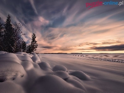 Zachód słońca, Drzewa, Zima, Śnieg, Pola