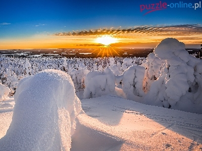 Puzzle Zachód słońca, Zima, Śnieg, Drzewa
