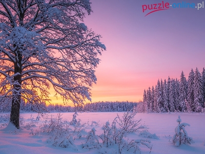 Zima, Krzewy, Drzewa, Zachód słońca, Ośnieżone