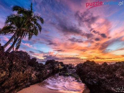 Palmy, Zachód słońca, Skały, Hawaje, Morze, Chmury