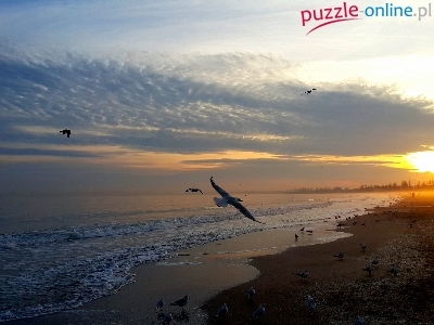 Puzzle Zachód Słońca, Morze, Plaża, Ptaki