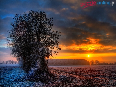 Zachód, Szadź, Drzewa, Pole, Słońca