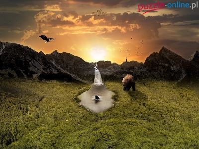 Zachód Słońca, Fantasy, Niedźwiedź, Ptak, Góry