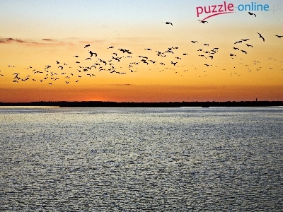 Puzzle Zachód Słońca, Jezioro, Ptaki, Niebo
