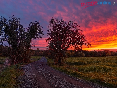 Droga, Drzewa, Pole, Zachód słońca, Roślinność