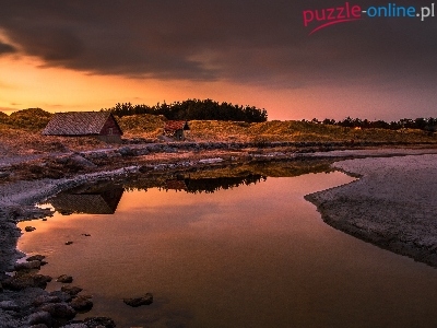 Puzzle Zachód, Domek, Rzeka, Słońca