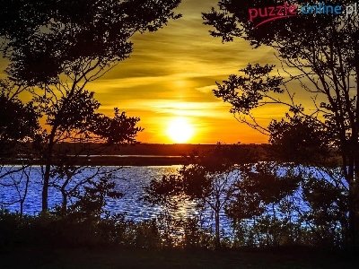 Puzzle Zachód Słońca, Rzeka, Drzewa