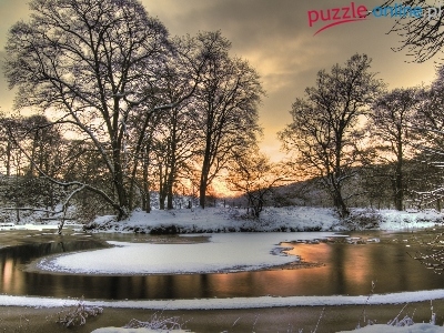 Zachód, Drzewa, Zima, Rzeka, Słońca