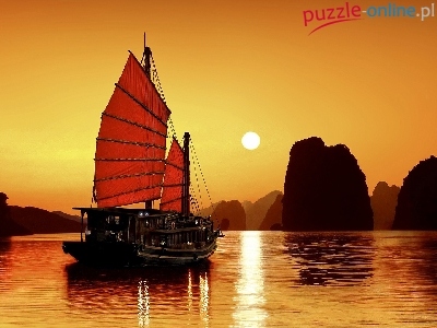 Zachód, Żaglowiec, Morze, Skały, Słońca